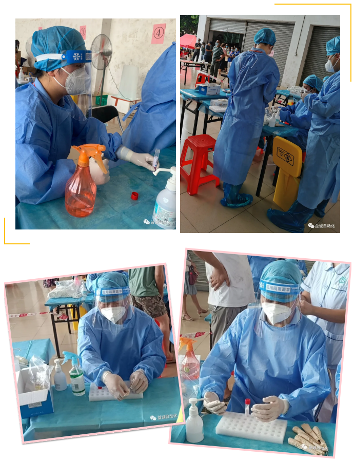 当日,东莞天气骄阳似火、烈日炎炎,室外气温高达三十多度。益诚自动化五名志愿员分两批轮班,投身抗疫一线。他们快速学习了工作要求,迅速上岗,承担了医护人员采样辅助、封瓶、包装检测试管等工作。